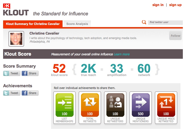 Providing the magic mirror to see one’s Twitter influence is the task of measurement applications like Klout, Twitalyzer and PeerIndex. To put it simply, these services try to give you a number by which to compare yourself to other users. If you have a high score, the theory is that a person has a lot of “influence” (the power you have to sway someone’s opinion or behavior via your tweets). This lucky lass or lad then is worthy of more money for social media consultant fees. That’s the theory.